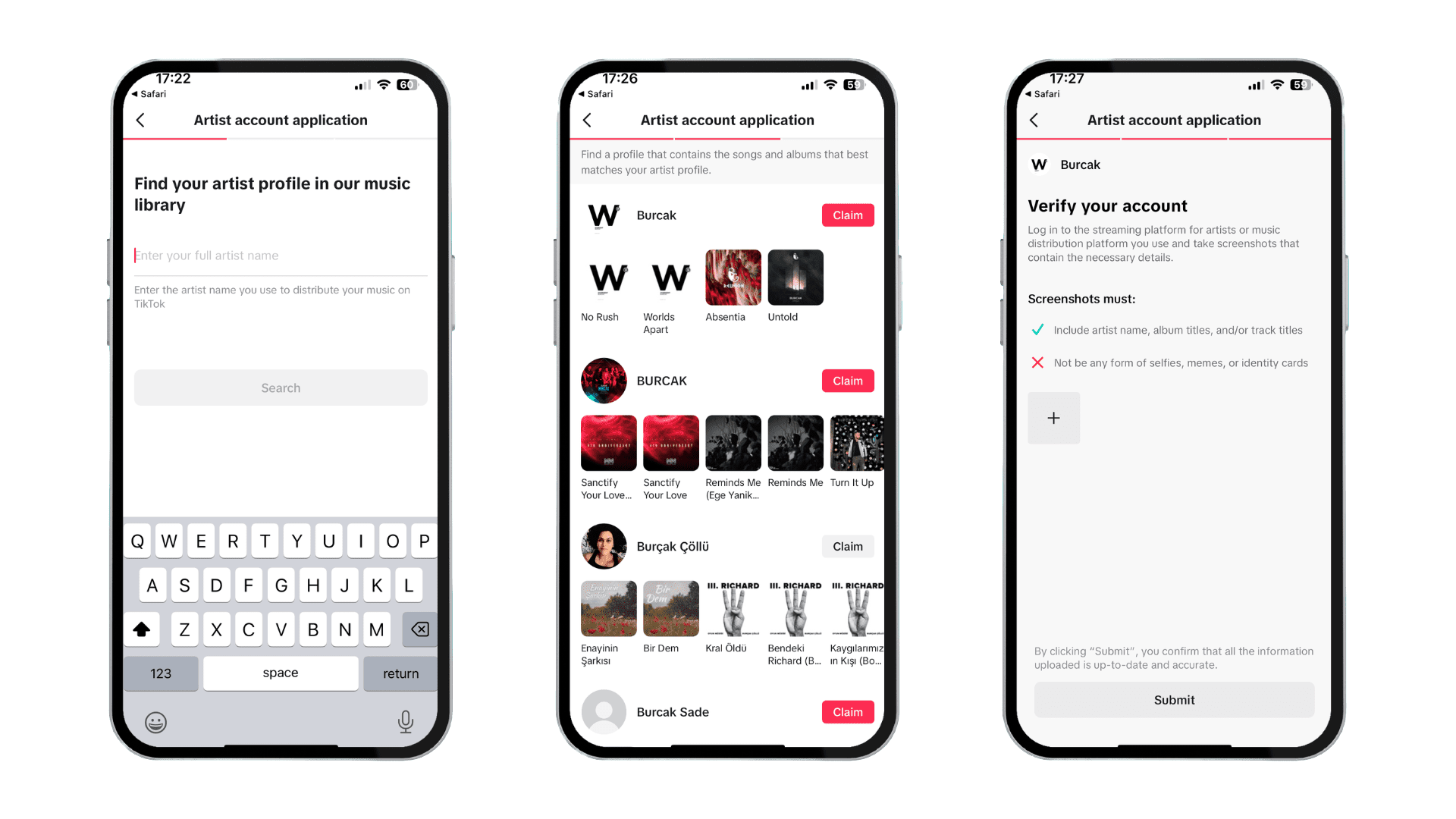 Artists can obtain certification directly through the TikTok app on their mobile devices by following the link here. During the application process, it is necessary to enter your artist name and locate your profile, followed by verifying the account with screenshots from an existing artist profile on a streaming or distribution platform. The requirements are listed on the relevant page (See the mobile images below).